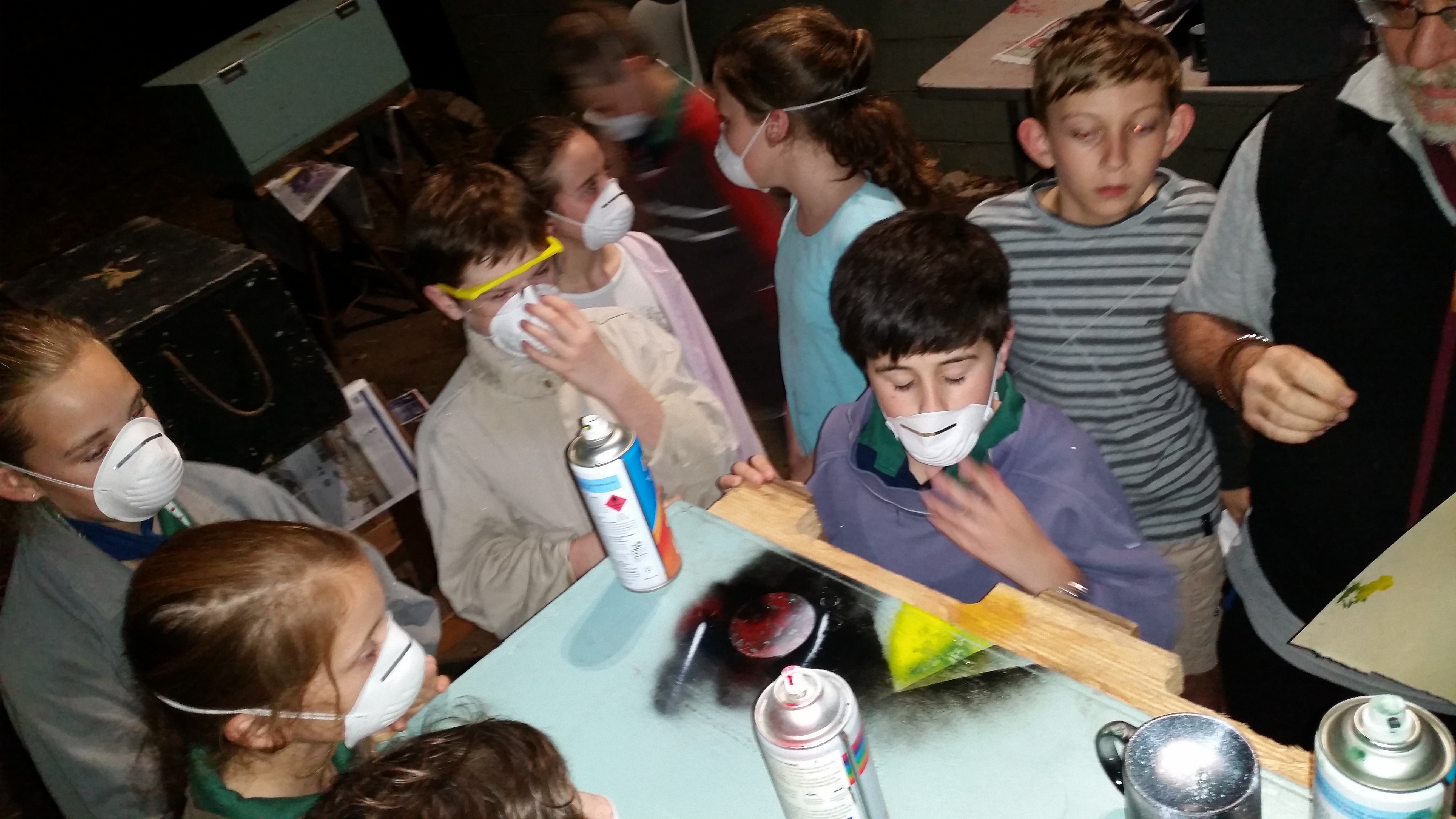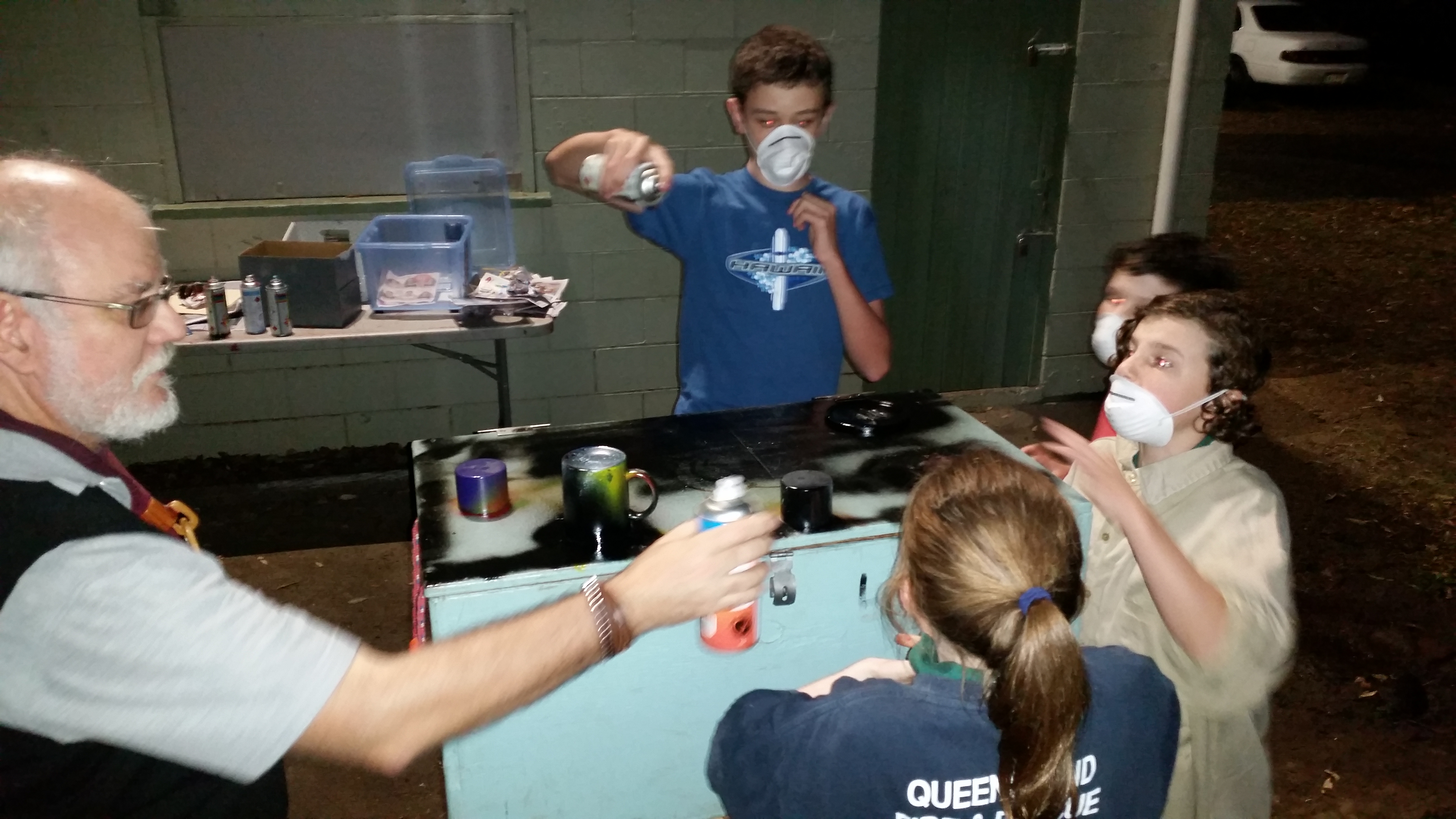 In addition to painting our fabulous new patrol boxes with a bit of help from Raven, we began the night with a very special ceremony. Five of our scubs (cubs-linking-to-scouts) were invested fully into the scout section. Ciara, Emily, Tom, Millie and Sophie were very excited to finally become fully fledged scouts. We held the investiture in the bushland of Mott Park with everyone having glow sticks to help light the way. After a farewell cub parade from our Group Leader/Cub Leader Hawkeye, each of the scubs was carried through the investiture gateway on a chair chariot by their new patrol members. Once everyone was into the scout circle each scub wrote their name on the gateway crossbeam – the list is getting long and everyone loves looking at who has gone before. Emily, Millie and Tom were invested into Penguin Patrol and Ciara and Sophie into Panther Patrol. As usual there was some excellent descriptors by the PLs as to why their patrol is the best and a general welcoming of all the new scouts.