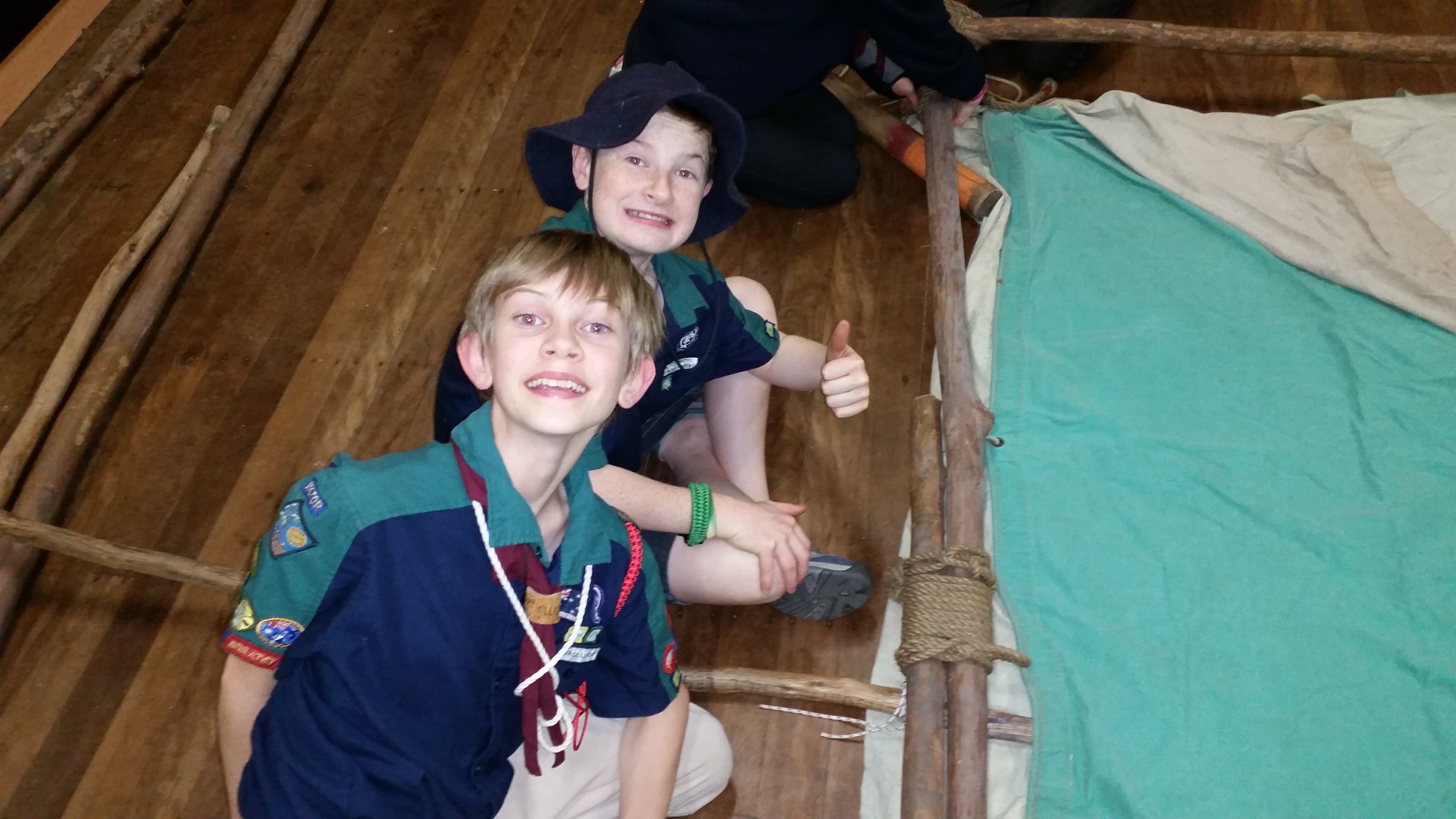 Who ever said a bit of wet weather would stop a scouting program? When it comes to rain there are two options: put on a rain coat or find an alternative. This week we were planning to learn about Queenslander tent construction. Putting up tents in the rain when you’re not on camp isn’t much fun so we took this one inside. For many this is the first time they’ve even seen one of these tents so it was a bit of fun.